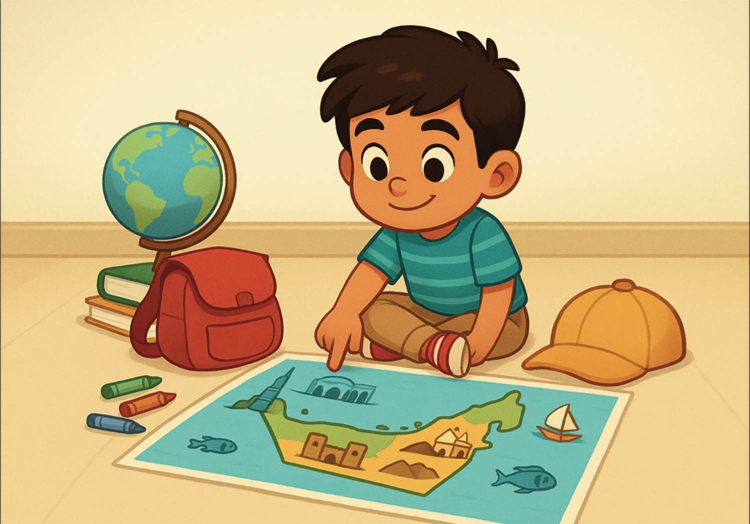 mountains, and splashes in Fujairah’s sea, until his backpack holds seven sparkling treasures — each a memory of his country. More than souvenirs, these treasures reveal the true gift: love of the homeland and the joy of exploration. This story encourages children to celebrate the beauty and diversity of the UAE, while also introducing days of the week, landmarks, and values of pride and gratitude .